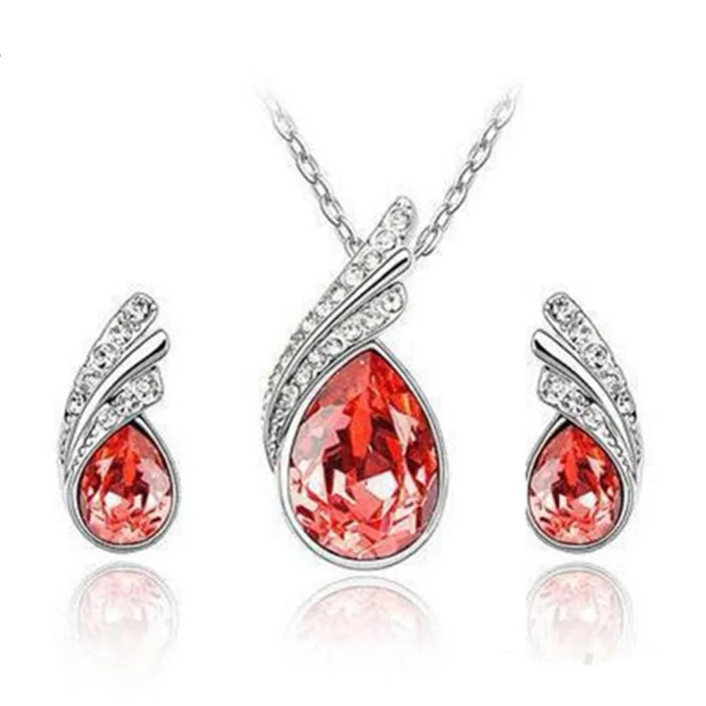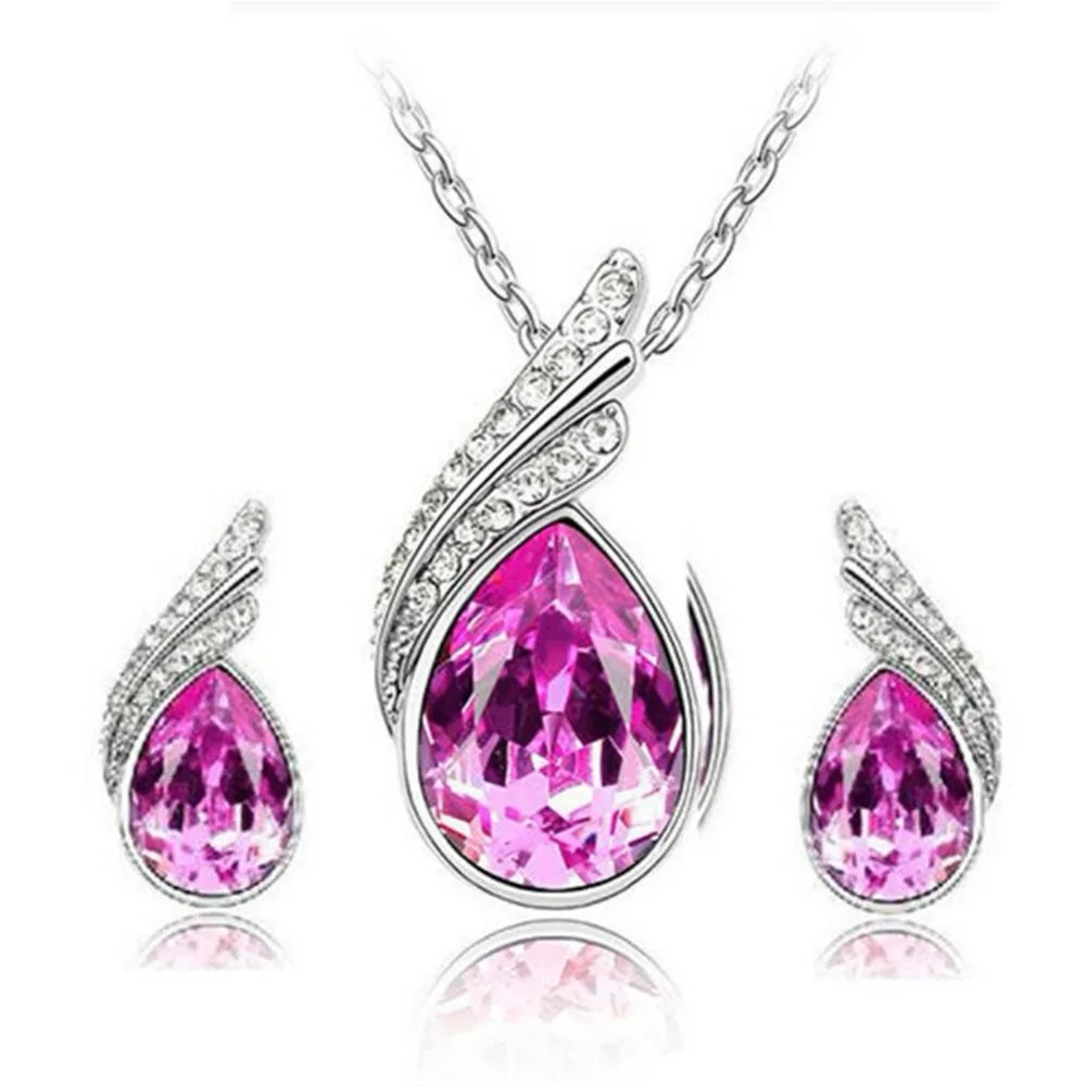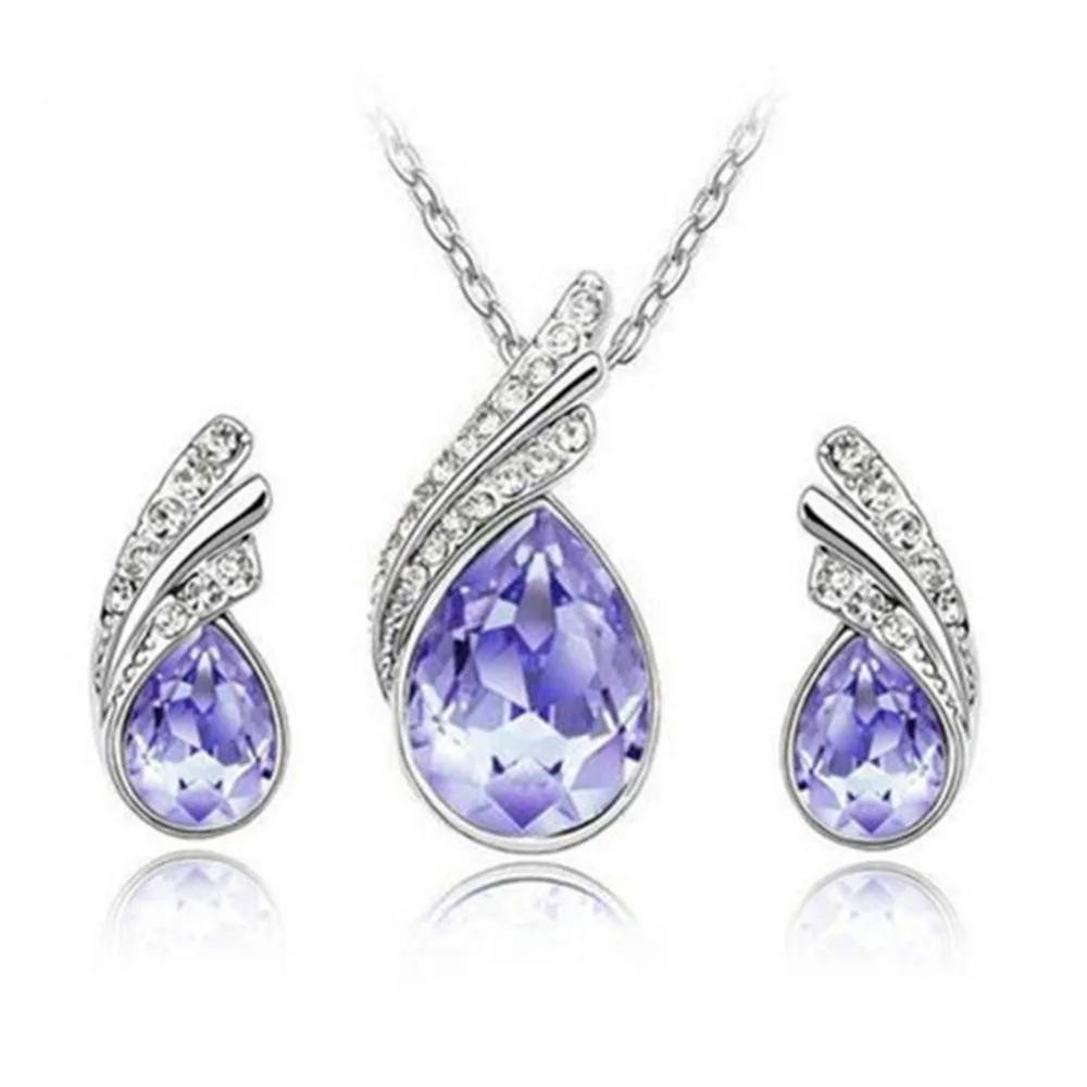 New Fashion Elegant Bridal Jewelry Waterdrop Crystal Leaf Silver Plated Necklace Earring Set For Women