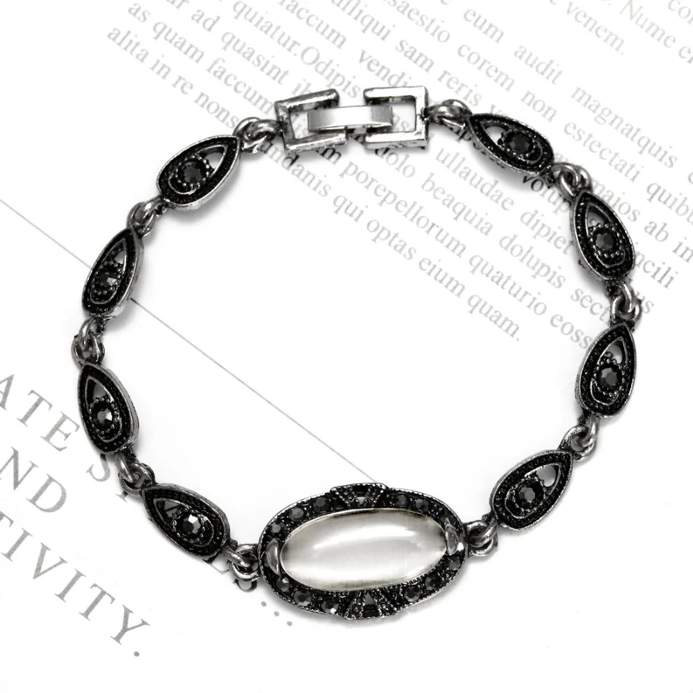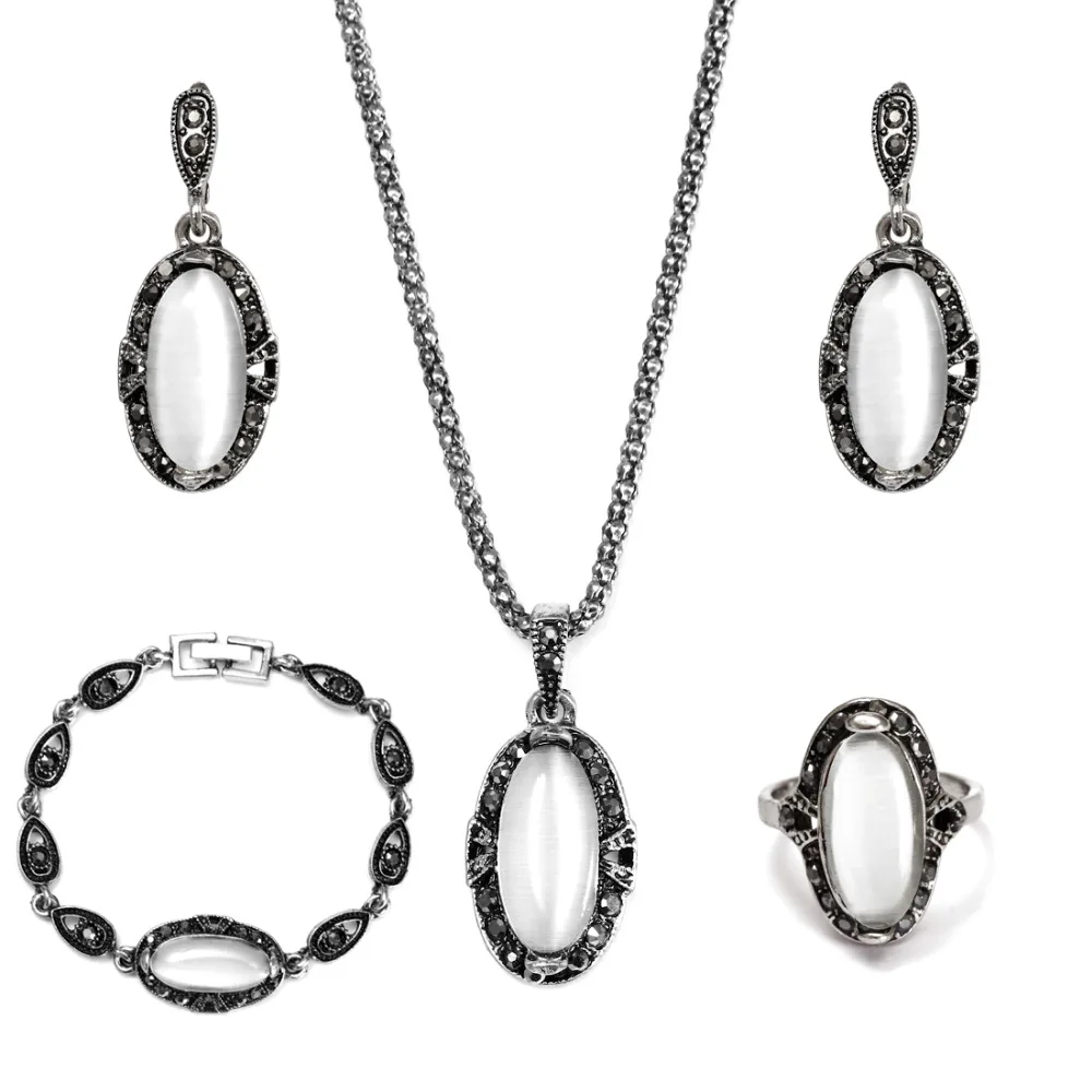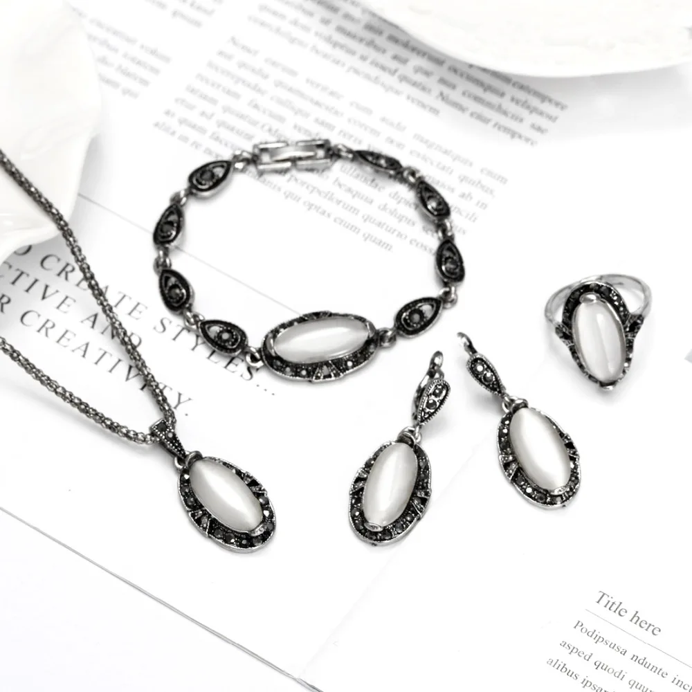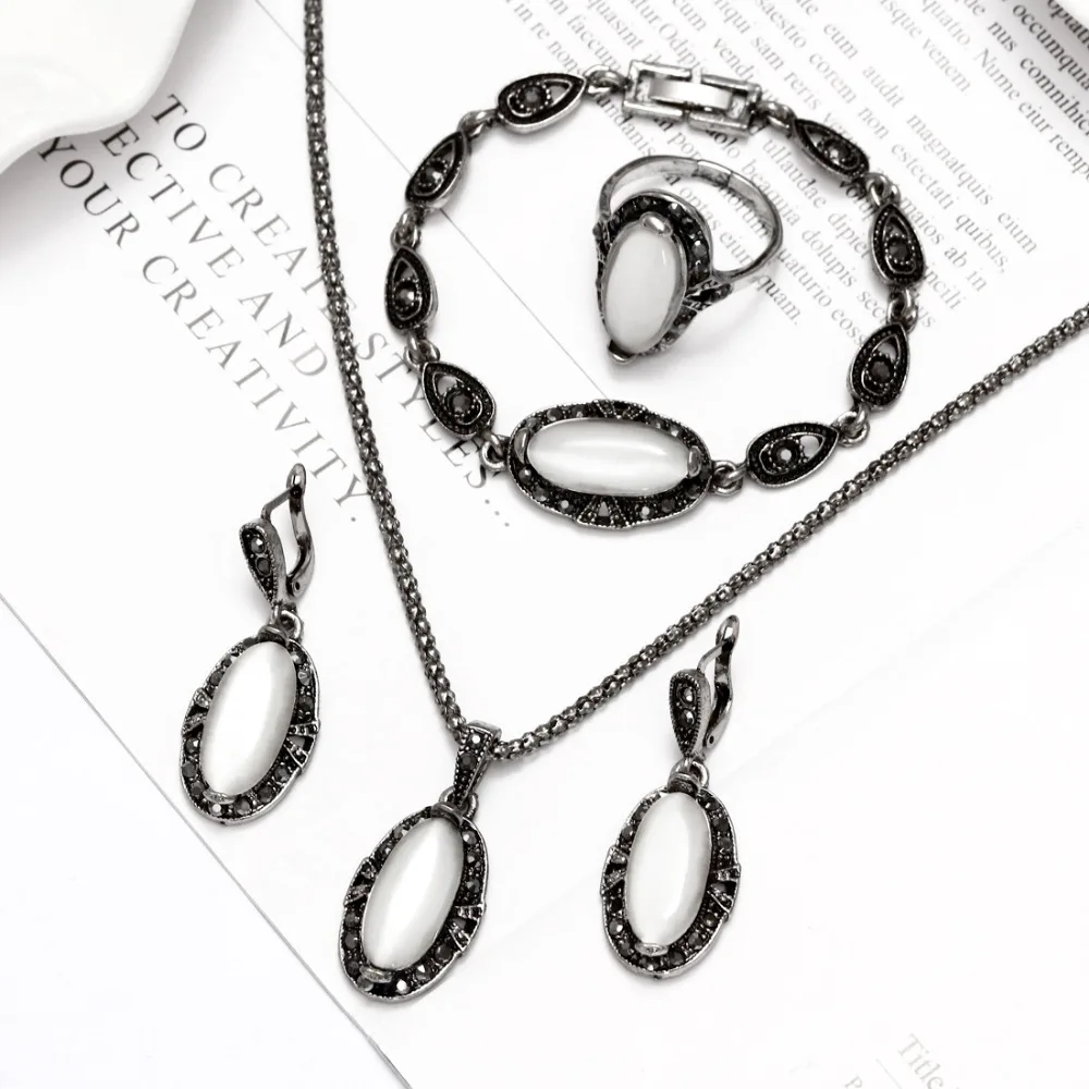Promo Vintage Opal Stone Jewelry Set Fashion Pendant Necklace Set Antique Silver 4Pc Jewelry Party Costum